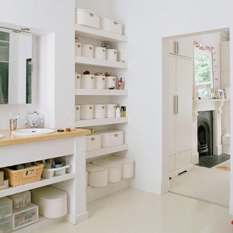 Bueno ésta idea definitivamente no es lo máximo PERO es para que veas que no todo debe ser lo mas creativo para verse bien, aqui da la sensación de ser un espacio reducido por el tipo de lavabo, pero con uno o dos estantes( no muy anchos ) para guardar tus cosas de manera ordenada cambia mucho.Si se te hace muy plano y aburrido pero es lo que ya tienes o lo único que puedes hacer por razones de espacio u otra cosa, haz que quede mas vistoso y lindo con lo de adentro, por ejemplo, toallas de color, ya sea monocromático o en colores contrastantes, canastos, etc…